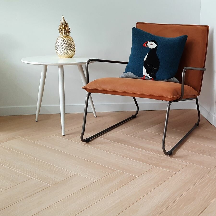 Deze blanke laminaatvloer brengt een mooi contrast in de ruimte en past erg mooi met verschillende groentinten. Lichte naturellen en zwarte accenten zorgen hierbij voor een fijn contrast. Breng de natuur in huis met wat grote planten, dat maakt het urban plaatje compleet. De kleur is tijdloos en hoewel een visgraatpatroon momenteel helemaal hip is, heeft het jaren geleden al laten zien dat het een geraffineerde basis geeft aan een ruimte. Precies wat je zoekt!