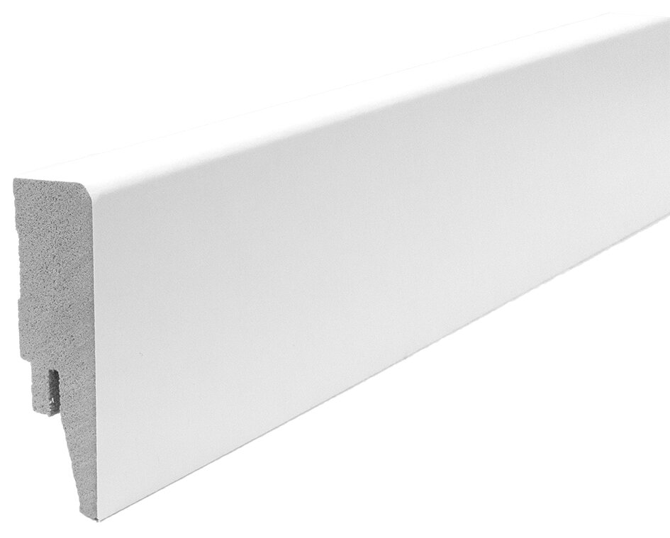 Watervaste witte folie plint. Gemaakt van een grijs type kunststof, waardoor deze plint watervast is. Toch is de plint licht van gewicht. 70mm hoog.